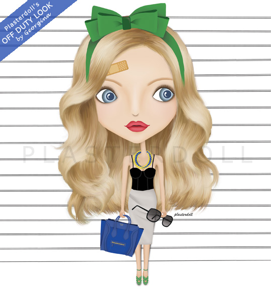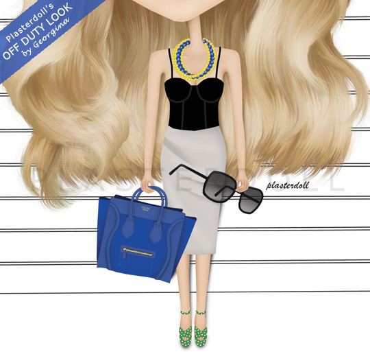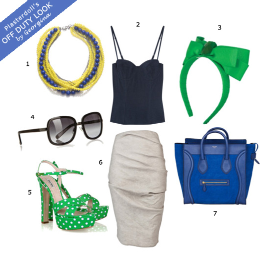 1| Yellow and Blue Torsade Necklace (from Charm & Chain)  2| L’Agence Exposed-Cup Cotton Corset Top (from net-a-porter.com)  3| Sereni & Shentel Kuching Cat Headband in Emerald Green (from sereniandshentel.com)  4| Chloé Wide-Framed Sunglasses  5| Miu Miu Polka-dot Satin-twill Sandals (from Miu Miu)  6| La Petite S*****’s Ruched Stretch-twill Pencil Skirt (from net-a-porter.com)  7 | Celine Boston Tote (from Celine)