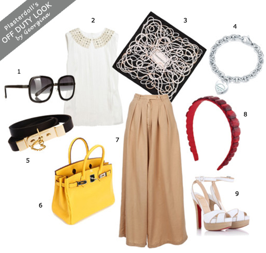 1| Chloé Wide-Framed Sunglasses 2| Chloé Swarovski Crystal-embellished Silk Top (from net-a-porter.com) 3| Tiffany Pearls Scarf (from Tiffany & Co) 4| Tiffany Heart Lock and Bracelet (from Tiffany & Co) 5| Armani Exchange Skinny Leather Belt (from Armani Exchange) 6| Hermes Birkin 7| Maison Martin Margiela Wide Leg Trousers (from farfetch.com) 8| Sereni & Shentel Ice Ice Baby Headband in Matte Red (from sereniandshentel.com) 9| Christian Louboutin Vivaeva 160 Platform Sandals (from mytheresa.com)